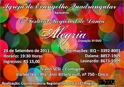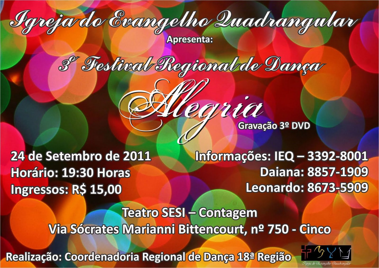 É com muita alegria que gostaríamos de convidar o seu ministério de dança para se apresentar no nosso 3º Festival Regional de Dança – 18º Região ( Igreja do Evangelho Quadrangular) que se realizará no dia 24 de Setembro de 2011 (sábado) às 19:30 no Teatro SESI em Contagem.